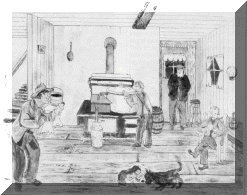 The pioneers built shacks with scooped roofs in the middle the virgin forest. They cleared the land of heavy timbers. The lakes and Picanoc River provided them with fish. They hunted deer, moose, grouse and rabbits in the nearby forest and bought horses, cows, sheep, pigs and hens. Women made coats, pants and shoes out of deer hides. After soaking the hides for a few days the hair was loose enough to be scraped of, and then the hide was stretched and pulled until it was soft to work. Wool from sheep was spun to make warm clothes for the winter. Early settlers made sauerkraut from cabbage. They chopped cabbage and layered it with salt in large wooden barrels. The cabbage fermented in a warm place for about three weeks. It stank up the whole house. When finished, it was stored in a cold place to be used throughout the winter. Sun-dried berries were stored all winter as well. Milk and cream was separated. The cream was made into butter and poured into molds. The cover of the molds had a floral pattern which left its imprint on the butter. The beautifully carved molds were stored in stone crocks. Eggs were also stored in stone crocks. Potatoes, carrots and other root vegetables were stored in a root cellar.