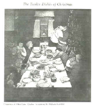 =s invitation, has inspired them to revive some Old Country culture. That=s her wagging her finger at her grandson impatient to get eating and reaching for an extra oplatek. Roughly the order of dishes as the family would eat them is: barszcz (beet soup); uszka (dumplings with mushrooms); jellied fish; golabki (cabbage rolls stuffed with rice or buckwheat); fried carp; pierogi (dumplings stuffed with cabbage, cheese or potatoes); fruit compote; varied baked sweets (apple strudel, poopy-seed rolls). You may notice two empty chairs. They are ceremonially put there to welcome unexpected guests. Unlike Ukrainians, Poles always have a Christmas tree even if they are so poor that they have to use coloured paper to make decorations. --William Kurelek Christmas at Otter Lake is an oil painting with dimensions of 20" x 20", and is currently displayed at the Art Gallery of Hamilton, Ontario. I often like to believe that this is a painting of my kitchen at the Lepack homestead. |